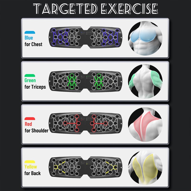 - CONVENIENT USE - The pushup board comes with instructions and is colour-coded, so you can work different muscle groups by following the colour cues. The complimentary auxiliary resistance bands can be used for standing exercises.