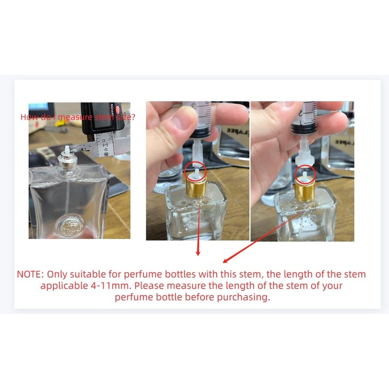 - 【NOTE】: Works for extracting perfume on the longer stem perfumes (Applicable Stem Size:Calibre 2mm-4.5mm Length:4mm-11mm,please measure the length of the stem of your perfume bottle before purchasing), for example, works for YSL L'Homme, Chanel Bleu and Dior Sauvage bottle, M.M. REPLICA;Does not work on MFK bottles, Kenneth Cole cologne, Chanel #5!,A&F Fierce.... You may lose 'some' of the liquid, We recommend testing with a cheap perfume first.