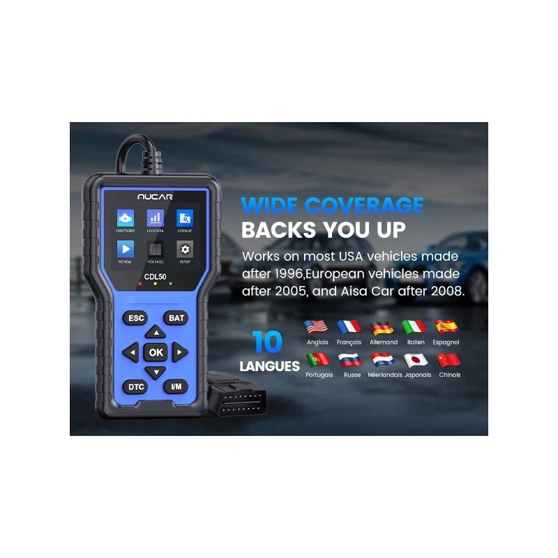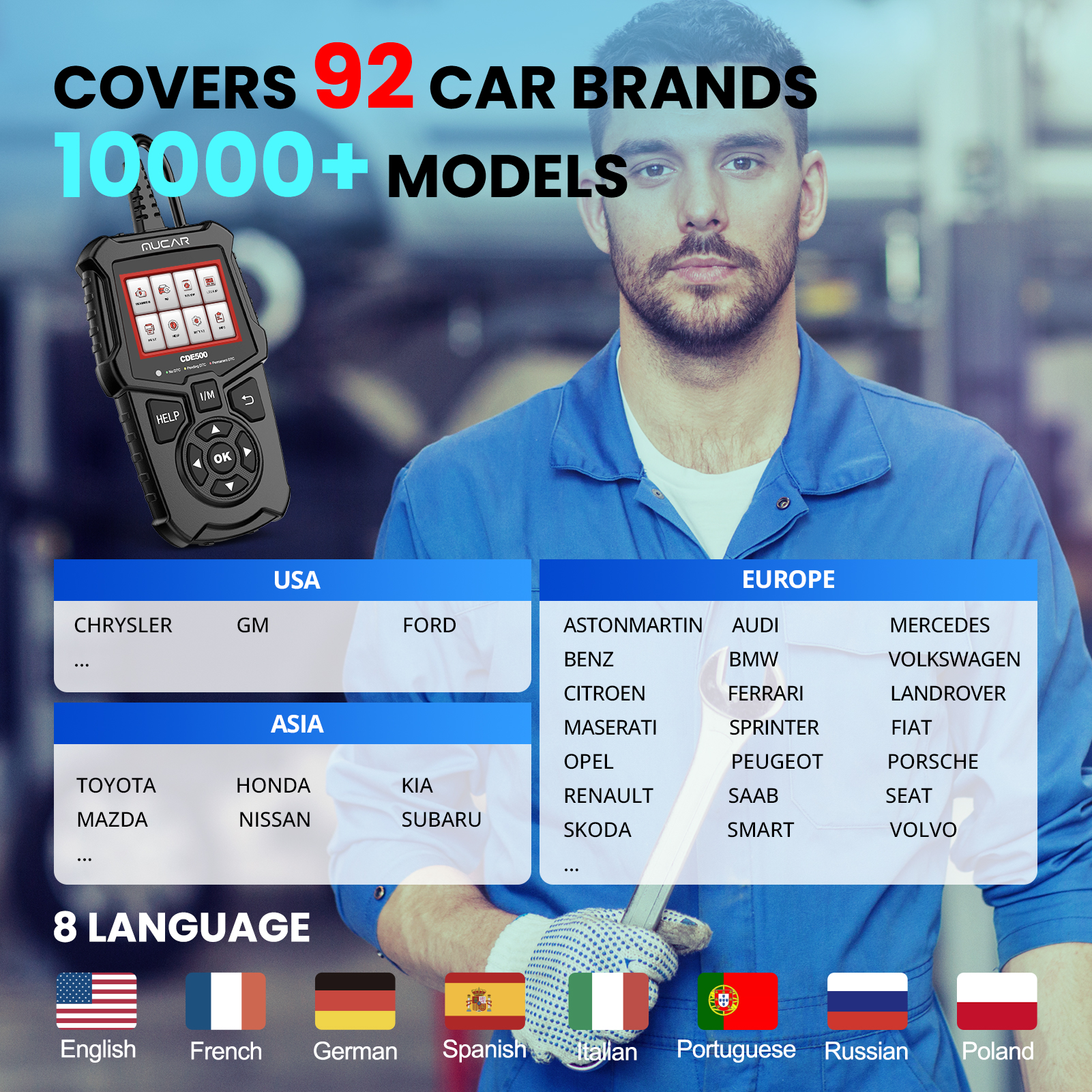 This car code reader automotive diagnostic tool works on most 1996 and newer US, EU-based cars since 2000, and Asian-based cars since 2008, based vehicles that are OBDII compliant. Supports English, French, Spanish, German, Russian, Japanese and Portuguese. (If you want to be more sure whether it is suitable for your car, you can tell us the Brand, Series and Year of the car.)