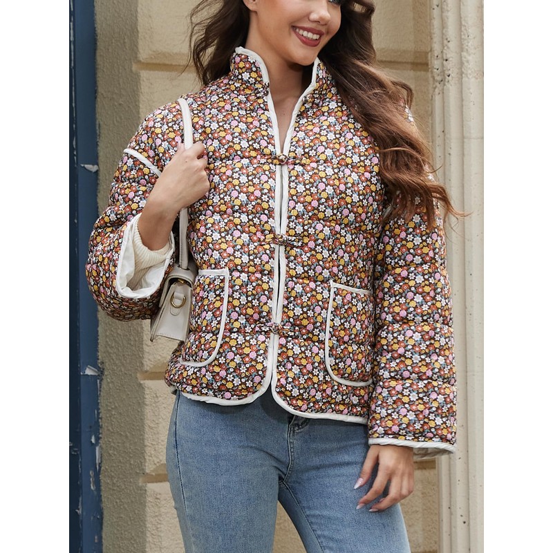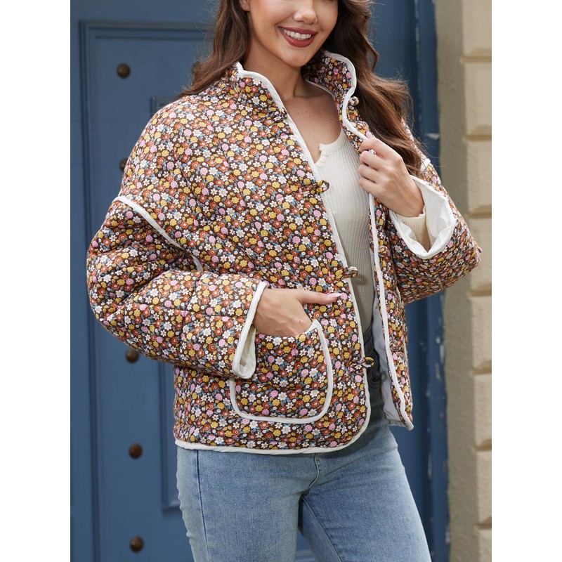 Muchpow Quilted Puffer Jacket for women Floral Printed Lightweight Cropped Button Down Outerwear with Pockets(Tangerine,Small)