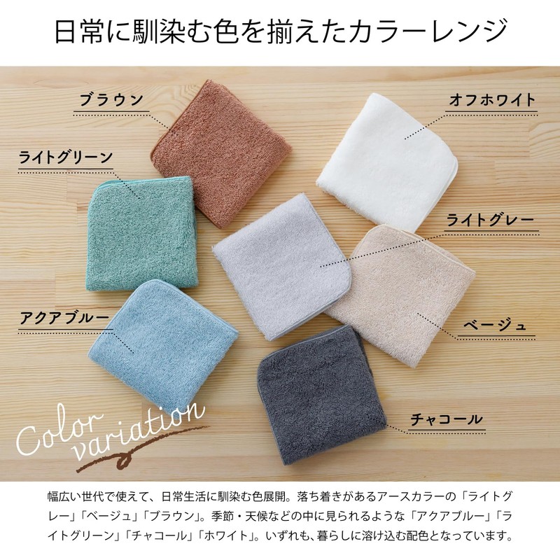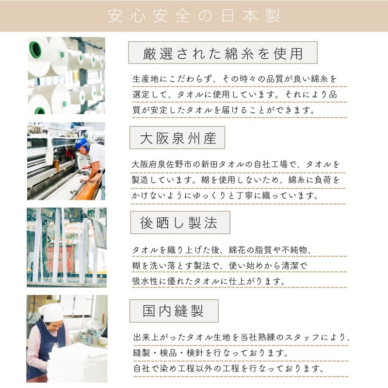 - (Attention to Details) We carefully weave the towels with an exclusive organic cotton towel loom in Nida City in Izumisano, Osaka Prefecture, using our own factory of Nida Towels, and then refined with enzymes to break down impurities and oils and stains. The fabric softener used for towels is naturally derived from soy milk isoflavone. The name tag may also come into contact with the skin, so it is made of 100% cotton