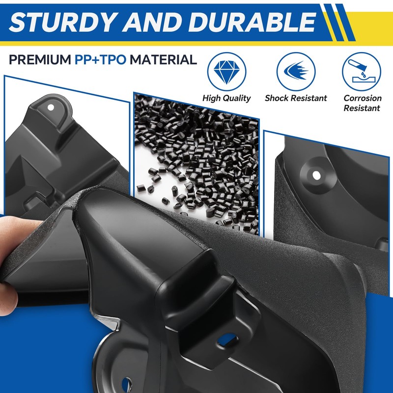 - 【Impact-Resistant Structure】Made of high-quality injection-molded PP and TPE, with a tough, impact-resistant thermoplastic structure. These fenders can block rain, snow, mud, sand, gravel, and salt, adding protection to your car and reducing dirt. Thermoplastics are also able to withstand extreme temperatures.