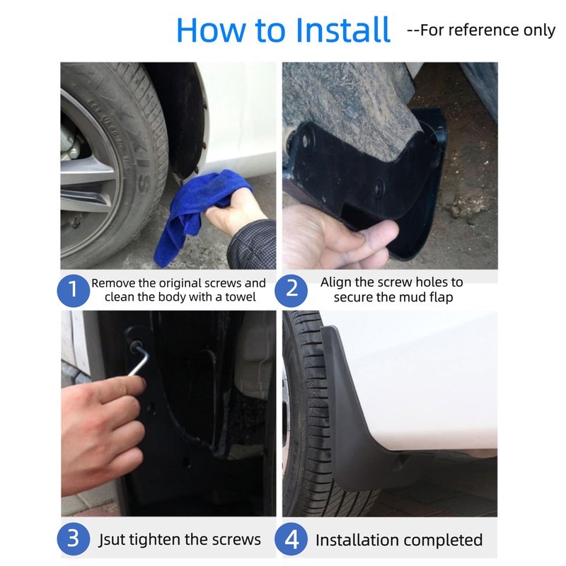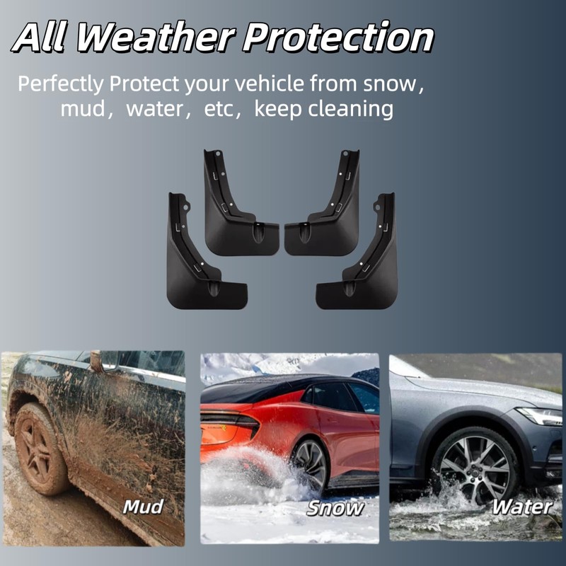 - [A Needed Protector & Stay in Place] - It is the best solution to get rid of snow, salt, sand, rocks and other debris when driving. Plus, does not add drag and reduce range. Even long time driving run, all the mud flaps will still stay in place; Good for more road trips and adventures