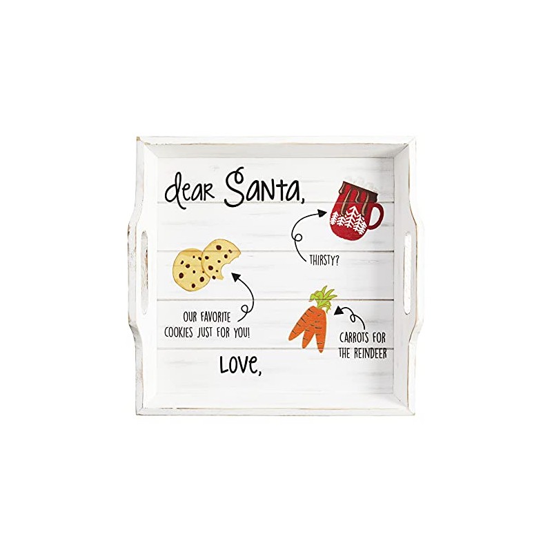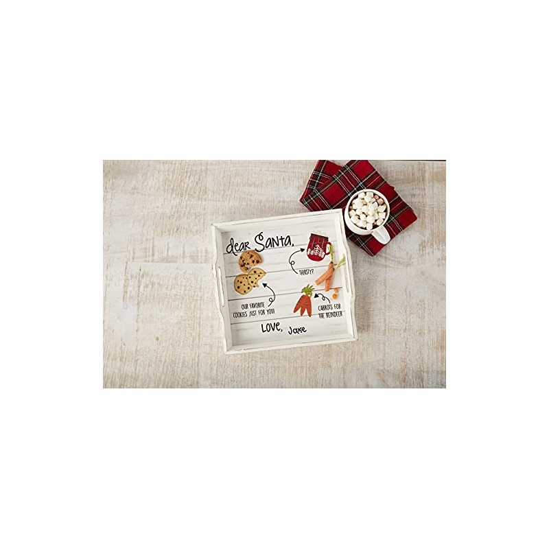 - Planked wooden tray with white-wash finish features side handles and designated areas to hold Santa's hot cocoa, cookies and the reindeer's carrots. Personalizable.