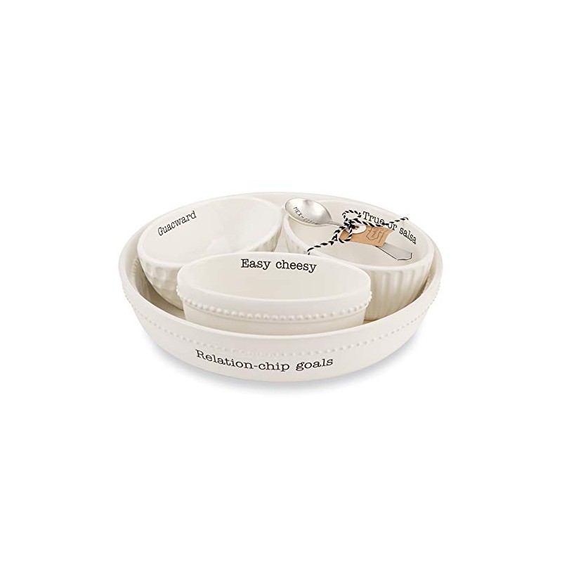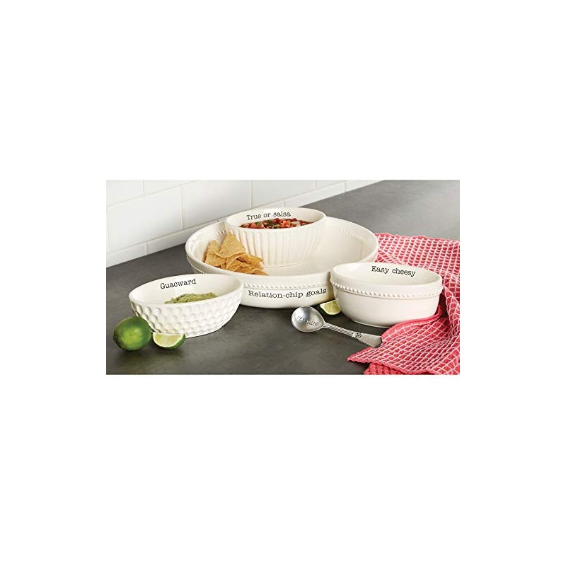 - 5-piece set. Large ceramic chip bowl features debossed sentiment exterior with raised beaded detail. Arrives tied with three coordinating salsa, guac and queso dipping bowls and stamped silverplate spoon.