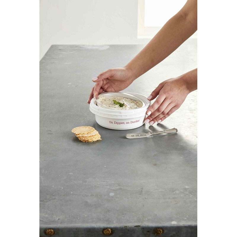 • The dip holder comes paired with a silverplate spreader that measures 5.75" long and reads "DIP THE HALLS".