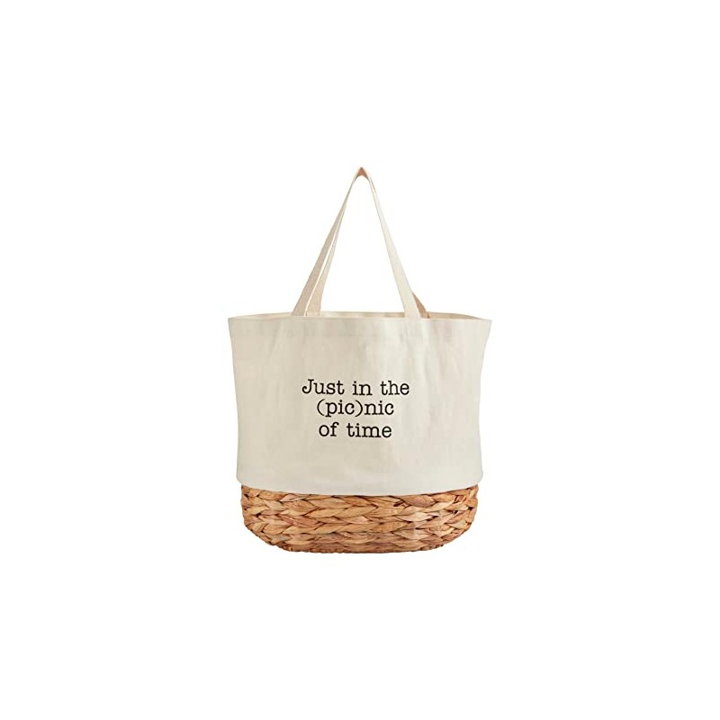 - Our Picnic Basket is essential for Spring. The canvas and water hyacinth picnic basket features two cotton webbing handles. The basket features the senitment "Just in the (pic)nic of time". This bag measures 16 1/2" x 13 1/2"