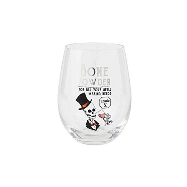 - Wine glass features a skeleton with a top hat drinking a glass of wine and says "Bone Powder, for all your spell making needs."