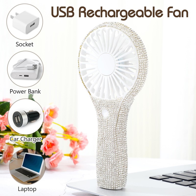 Mudder Rhinestone Handheld Fan Crystal Bling Mini Personal Fan Glitter Bedazzled Portable USB Rechargeable & Battery Operated for Girls Women Outdoor Travel Indoor Makeup Office(White,Not Foldable)