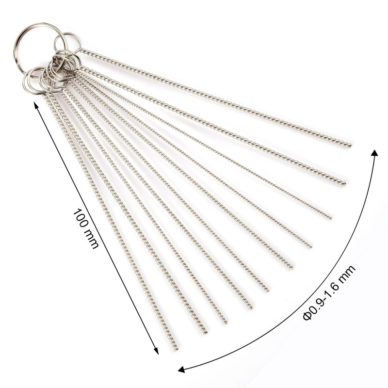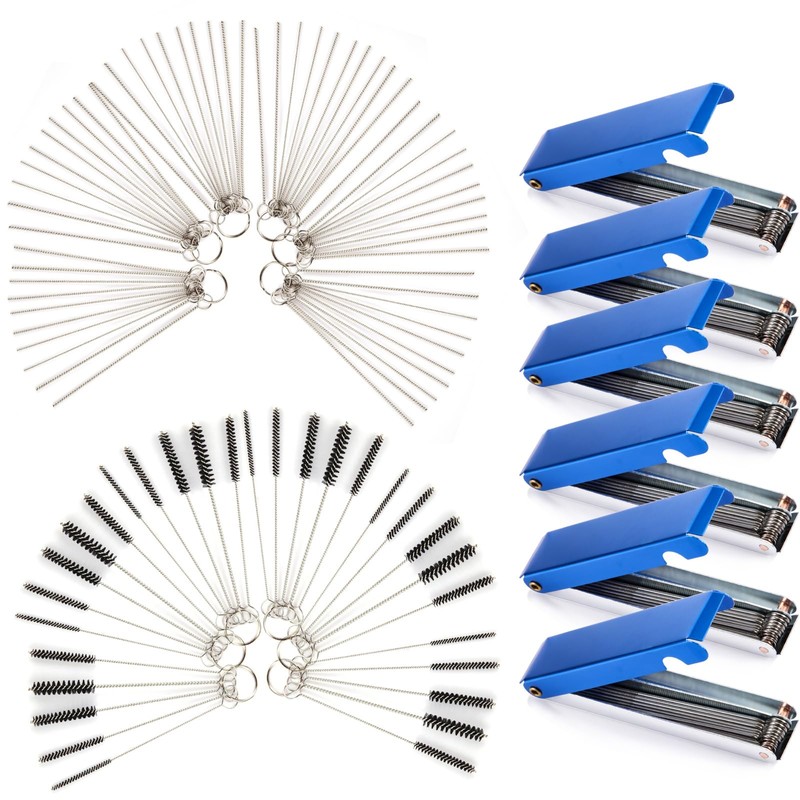 - Size: the diameter of stainless steel needle cleaning tools are 1.1 mm, 1.4 mm, 1.6 mm, 1.8 mm and 2.1 mm; The diameter of stainless steel nylon brush includes 2 mm, 3 mm, 4 mm, 5 mm and 7 mm, and all of their overall lengths are 11 cm, including brush size of 3 cm; The size of oil cleaner box is about 10.2 x 2.3 x 1.2 cm