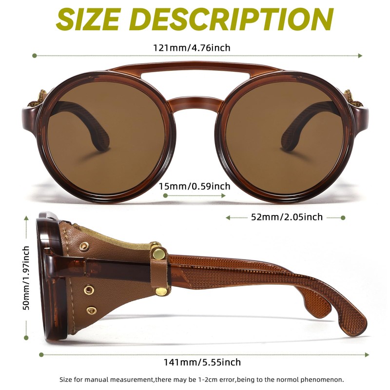 - CLASSIC STYLE STEAMPUNK DESIGN-Unique retro round steampunk retro style shades with leather side shields thar are strikingly dope. You will never be unnoticed with its unique gothic style. Can match almost all your outfits, this is one of the best shades you could have.