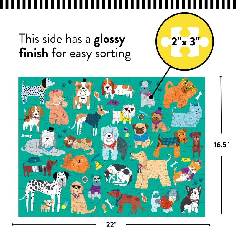 Style: **Cats & Dogs**Whether a dog family or a cat family, everyone can agree that the Mudpuppy Cats and Dogs Double-Sided Puzzle is a great family activity to enjoy together. Ideal for ages 6+, the 100-piece puzzle measures 22” x 16.5” and features colorful illustrations of adorable dogs on one side and charming cats on the other. One side of the puzzle is glossy and the other is matte for easy sorting. The 12.5” x 9” x 2” storage box is an ideal place to keep pieces safe, together and free from damage. Also makes a great gift for lovers of furry four-legged friends! For over 25 years, Mudpuppy has created quality non-digital puzzles, games and toys for children and families that facilitate creative play and imaginative thinking. All Mudpuppy products adhere to CPSIA, ASTM, and CE Safety Regulations. Environmentally conscious, the puzzle greyboard contains 90% recycled paper, the packaging contains 70% recycled paper and it is printed with no glare, nontoxic inks.