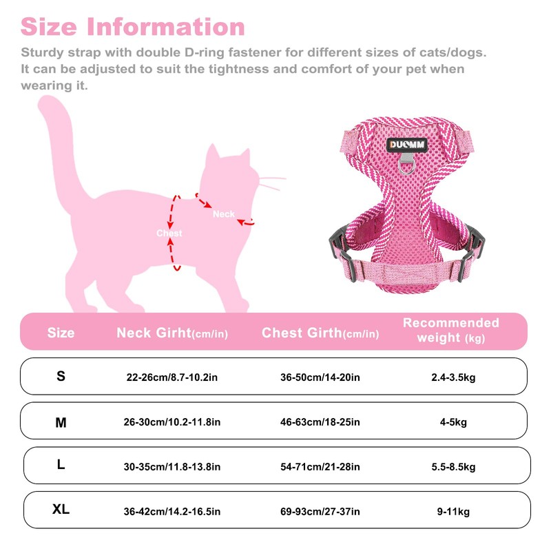 - 🐱Size Options - This cat harness has 4 sizes to fit kittens, medium cats, large cats, puppies, and small to medium sized dogs. When you are choosing a well-fitting vest harness for your cat, we suggest you measure your cat's neck/chest circumference and refer to the size chart to choose the best size. Set includes: 1 cat harness, 1 adjustable collar and 1 nylon leash.