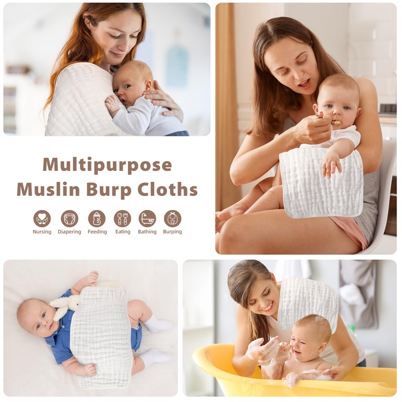 - 100% Cotton Burp Cloths: Our muslin burp cloths are made of 100% pure natural cotton, which is soft, breathable and skin-friendly. 100% Cotton burp cloths is the best fabric for babies. Our muslin cloths caresses every inch of the baby's sensitive skin like a mother's gentle hands. It feels very soft and is perfect for face, hands and body. Since our burp rag is 100% cotton, it may shrink slightly when washed for the first time. This is a normal phenomenon. Please feel free to use it.