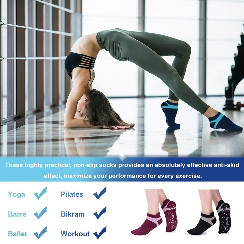 Muezna Non Slip Yoga Socks for Women, Anti-Skid Pilates, Barre, Bikram Fitness Socks with Grips, Size 5-10 (3 Pack: (Black/Navy/Burgundy)+Two-Color Grips)