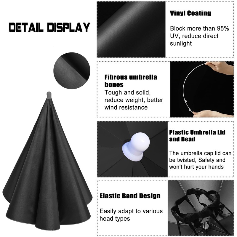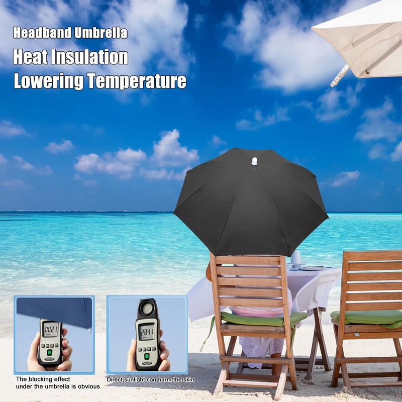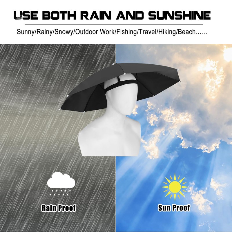 - [Rain and Sun Protection]: A head umbrella made of waterproof sunscreen nylon fabric can keep your head dry in the rain. Shades do not transmit light, are effective at isolating UV rays, and can keep the head shaded on sunny days. With good ventilation performance, there will be no Stuffy feeling. A fully-wrapped plastic umbrella cover and umbrella beads that are smooth will not hurt your hands. Metal umbrella frames to make the canopy last and last.