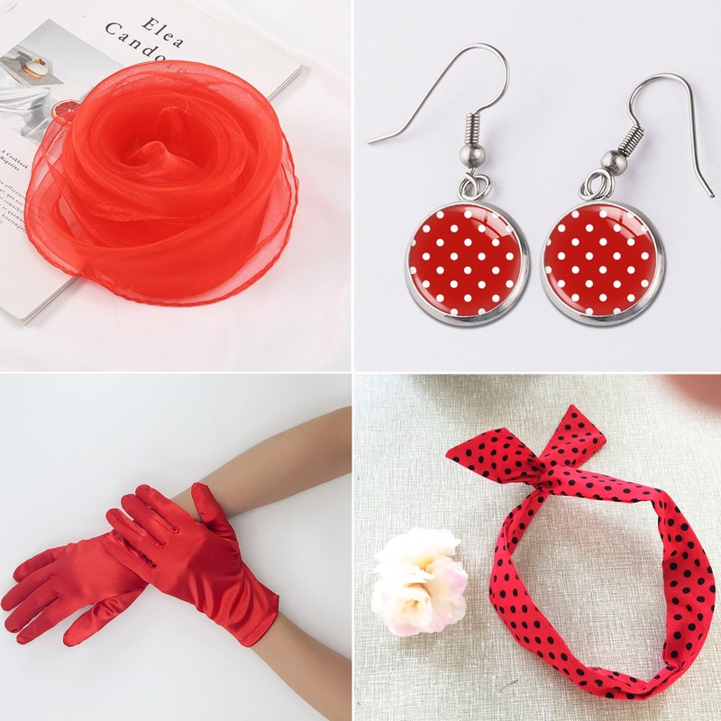 - [50s costume accessories]: Experience the classic 50s trend by buying all the accessories at once! We offer you a complete 50s costume: 1 pair of red gloves, 1 red bandana, 1 pair of sunglasses, 1 polka dot headband, 1 pair of polka dot earrings and stud earrings that will take you back to the 50s in no time at all and show you the perfect combination of classic and fashion!