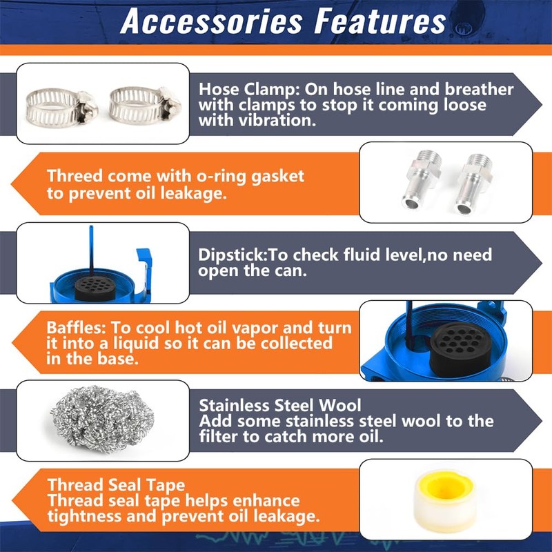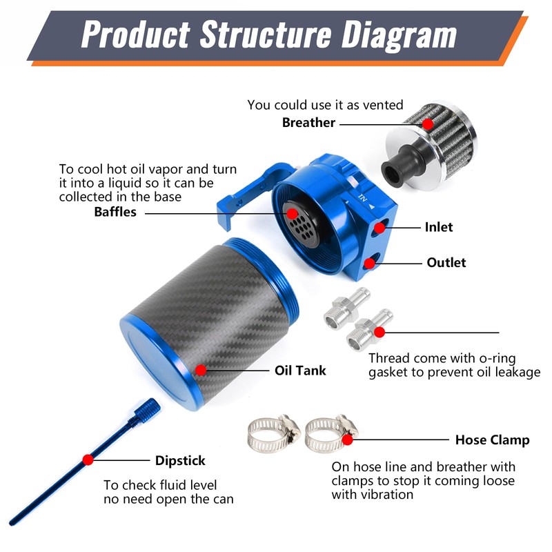 - 2 Types of Installation:Easy to install the baffled oil catch tank with breather filter as a vent system or without breather filter as a seal can, both for your option