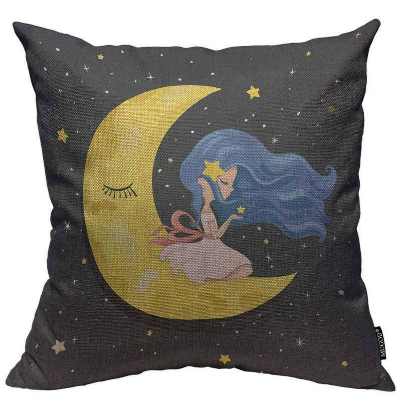 Mugod Fairy Girl Throw Pillow Cover Romantic Cute Cartoon Girl Sitting on The Moon with Stars Decorative Square Pillow Case for Home Bedroom Living Room Cushion Cover 18x18 Inch