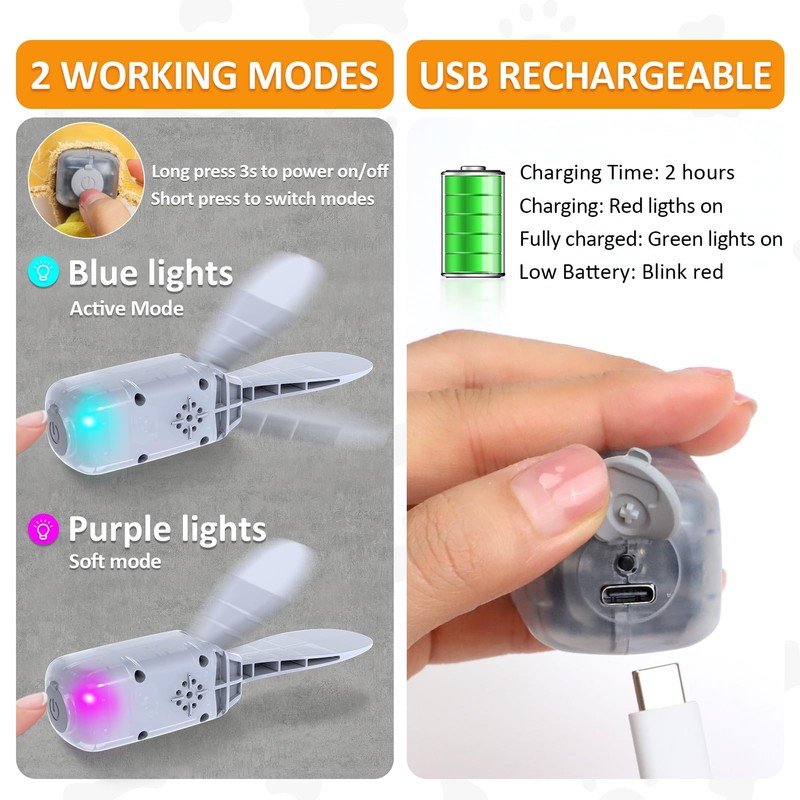 • Two working mode & Motion activate - Active mode(blue lights), Normal mode (purple lights). Long press 3s to power on, the puppy toys wiggling for 45s after every touched, attract dogs to play, expend your dogs’ extra energy
