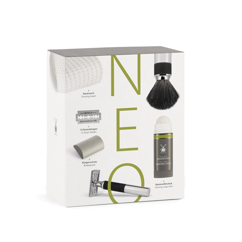 MÜHLE Gift Set NEO: Safety Razor and Shaving Brush Shaving Set |shave gift set including shave stick, blade guard, razor blade 10-pack and cotton shave towel