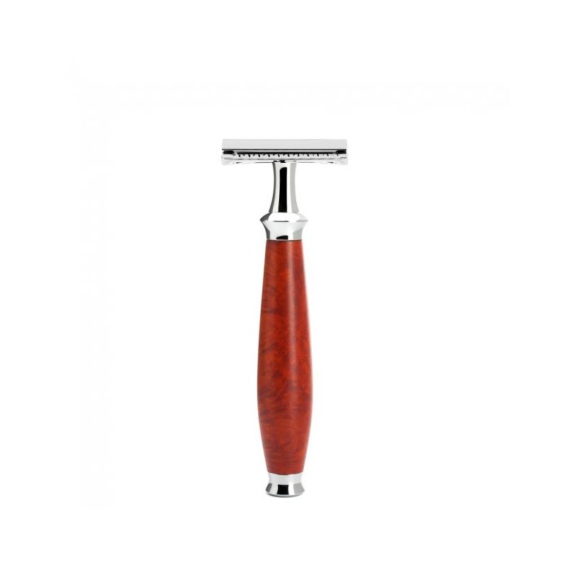 The Muhle R 59 SR Safety Razor Closed Comb is a classic safety razor with a handle made of briar wood and chrome-plated metal highlights.