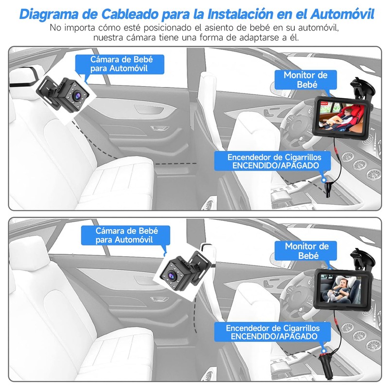 • Instalación sin esfuerzo: Asegura el monitor bebe camara en el reposacabezas, conecta el cable de video al monitor del tablero y conéctalo al encendedor de cigarrillos. Puedes instalarlo en solo 5 minutos