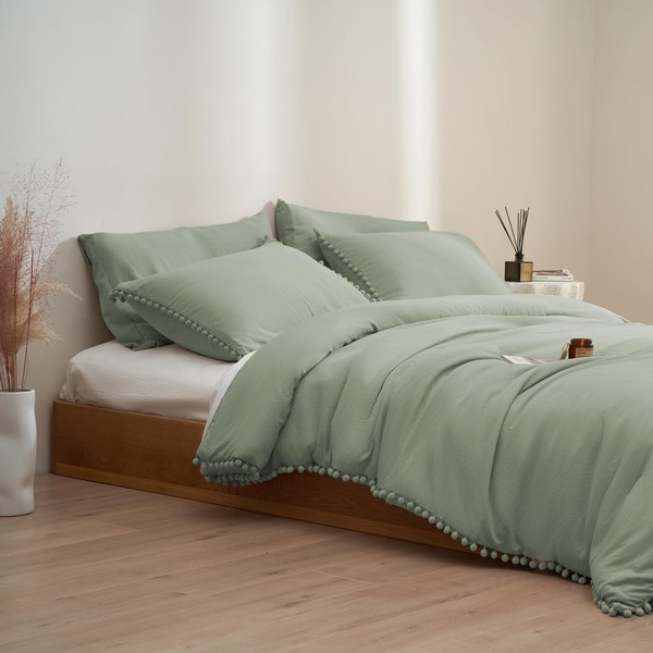 MUKKA Comforter Set 5-Piece Full Size Sage Green, Boho Pom Pom Fringe Comforter Sets Full Size, Bedding Comforter Set with 2 Pillowcases,2 Pillowshams