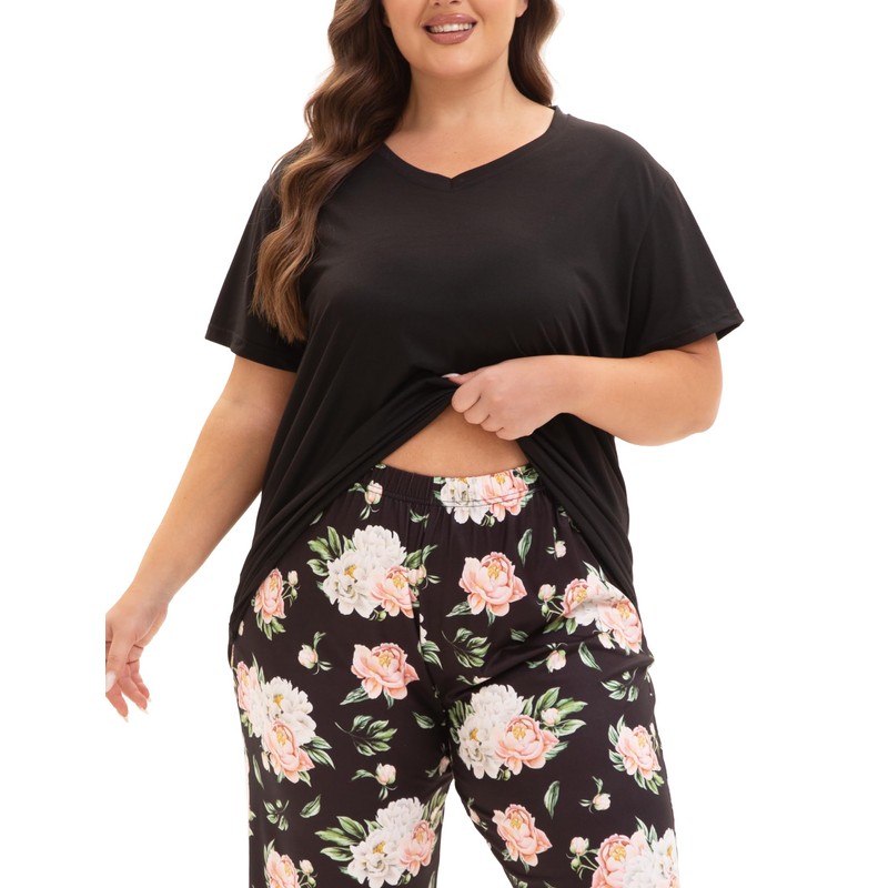 MUKVIK Plus Size Pajamas for Women Set, Womens Plus Size Short Sleeve V Neck Capri Pants Pajama Sets with Pockets(Floral Black 1,4X)
