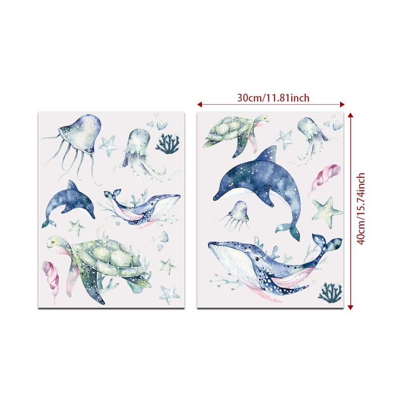 - 📦Package Content: You will receive 2 large sheets of underwater world themed wall stickers, each sheet measures about 40x30cm, there are a variety of marine elements inside, there are baby sharks, dolphins, turtles, octopuses, starfish, jellyfish and other cute sea creatures, you can enjoy decorating your rooms and bathrooms with the stickers according to your own ideas