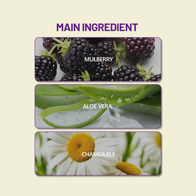 - ✔ Herbal Enriched Formula – Infused with mulberry extract, aloe, and chamomile to nourish and protect.