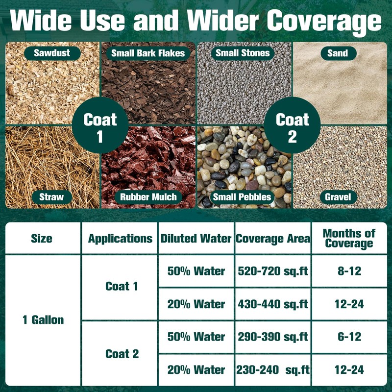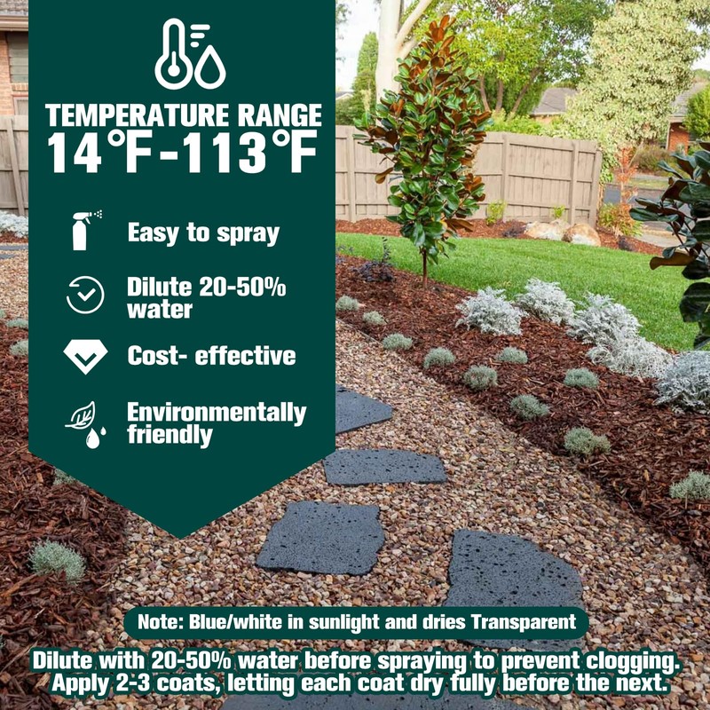 - 【Weed Suppression & Moisture Retention】 : Mulch glue assists in effectively suppressing weed growth by keeping mulch and other coverings in place, reducing the need for weed removal and maintenance. Mulch glue aids in moisture retention by preventing water evaporation from the soil's surface, reducing the frequency of irrigation.