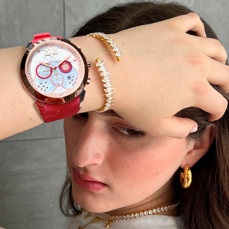 - MODERN FASHION AND VERSATILITY: The large face watch features an oversized design, this watch for women ensures readability and style. The curve ergonomic case enhances comfort, making it perfect for daily wear. With luminescent indexes and hands, this watch offers visibility in all lighting conditions. With a mother of pearl dial, crystal stones, and rose gold accents.inspired by traditional Mulco's collections and modern fashion.