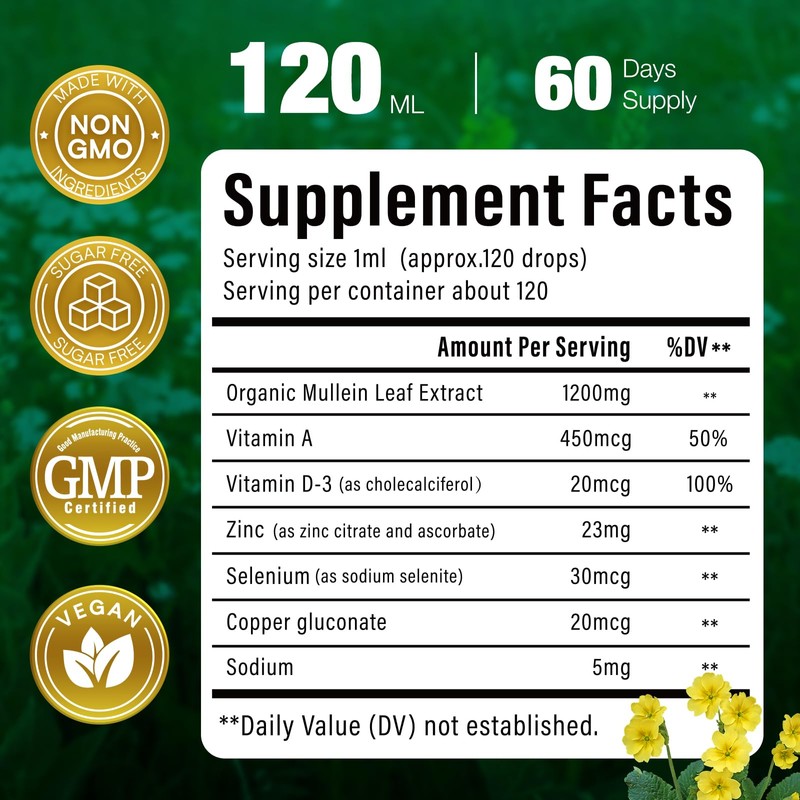 - 100% Safe, Natural and Alcohol-Free: Laboratory Tested, Trusted Ingredients, Superior Quality, 100% Guaranteed!Formulated with highest quality, Non-GMO Project Certified whole mullein leaf, our vegan Mullein is made in our GMP-certified facility and tested in third party lab. Our Mullein drop is based on vegetable glycerin and contains no alcohol or sugar.