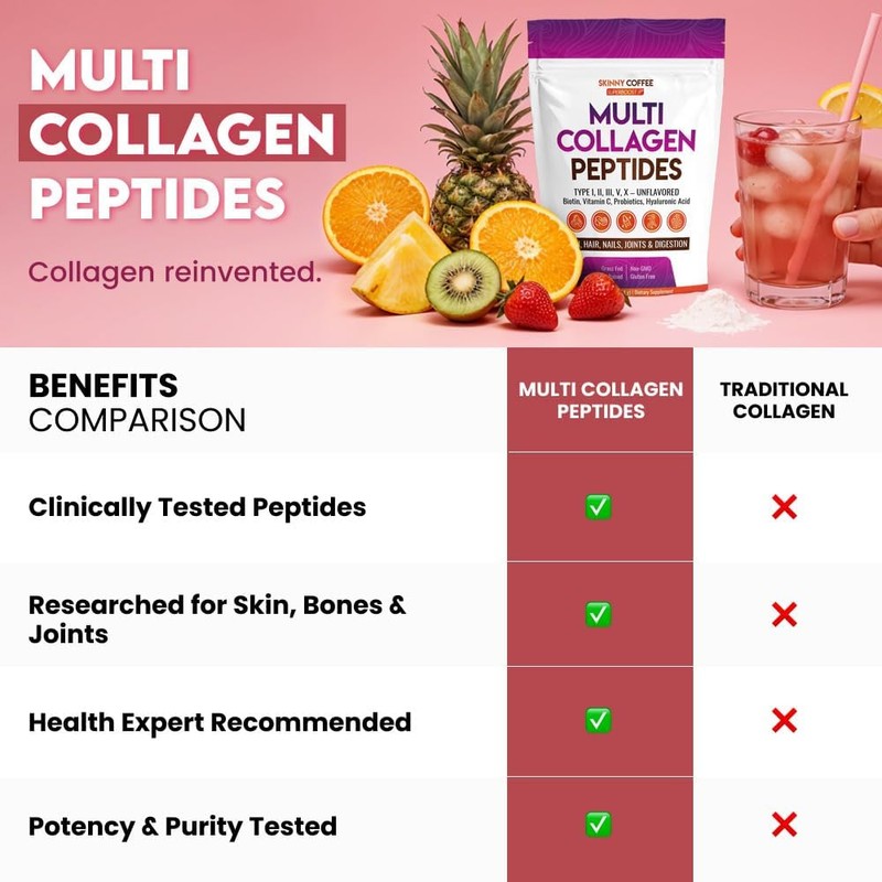 - Revitalize, Replenish & Nourish Efficacy: Taking multi collagen peptides powder can make skin firmer and more elastic, delay aging. This advanced formula is designed to superboost your overall health by enhancing the strength and elasticity of your joints, tendons, ligaments, skin, bones, muscles, hair, nails, and gut. With Multi Collagen Peptides, you're nourishing your body from within, ensuring a radiant and resilient you from head to toe