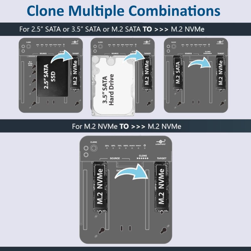 • Software Clone Function (SOFTWARE Cloning, Connected to a system using software to clone) > Clone M.2 NVMe to M.2 NVMe > Clone M.2 NVMe to M.2 SATA > Clone M.2 NVMe to 2.5” SATA > Clone M.2 NVMe to 3.5” SATA > Clone M.2 SATA to M.2 NVMe > Clone 2.5” SATA to M.2 NVMe > Clone 3.5” SATA to M.2 NVMe