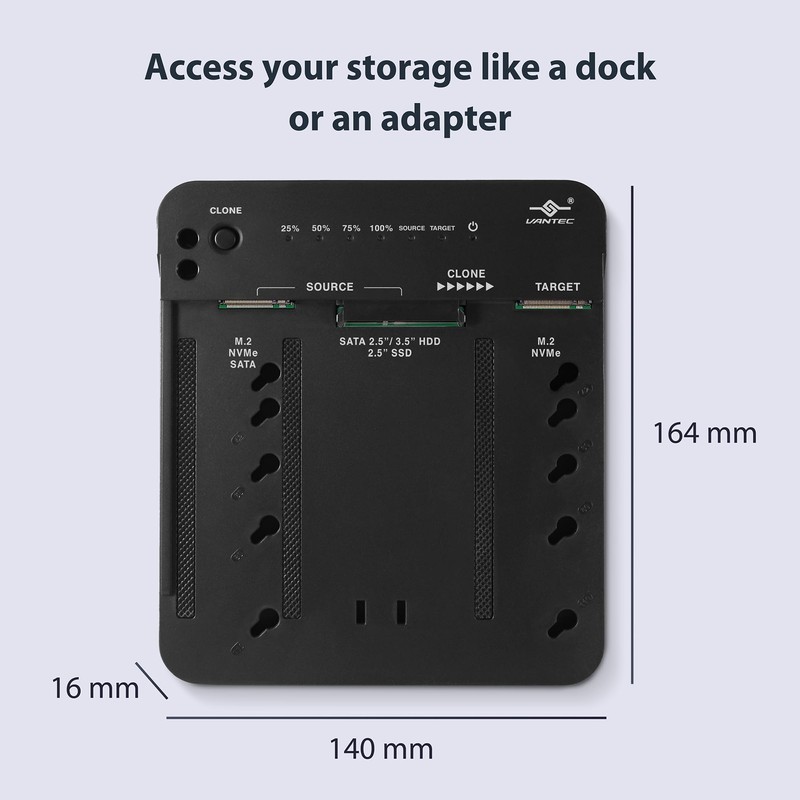 • Multi-Clone Function (STANDALONE cloning, not connected to system) > Clone M.2 NVMe to M.2 NVMe > Clone M.2 SATA to M.2 NVMe > Clone 2.5” SATA to M.2 NVMe > Clone 3.5” SATA to M.2 NVMe