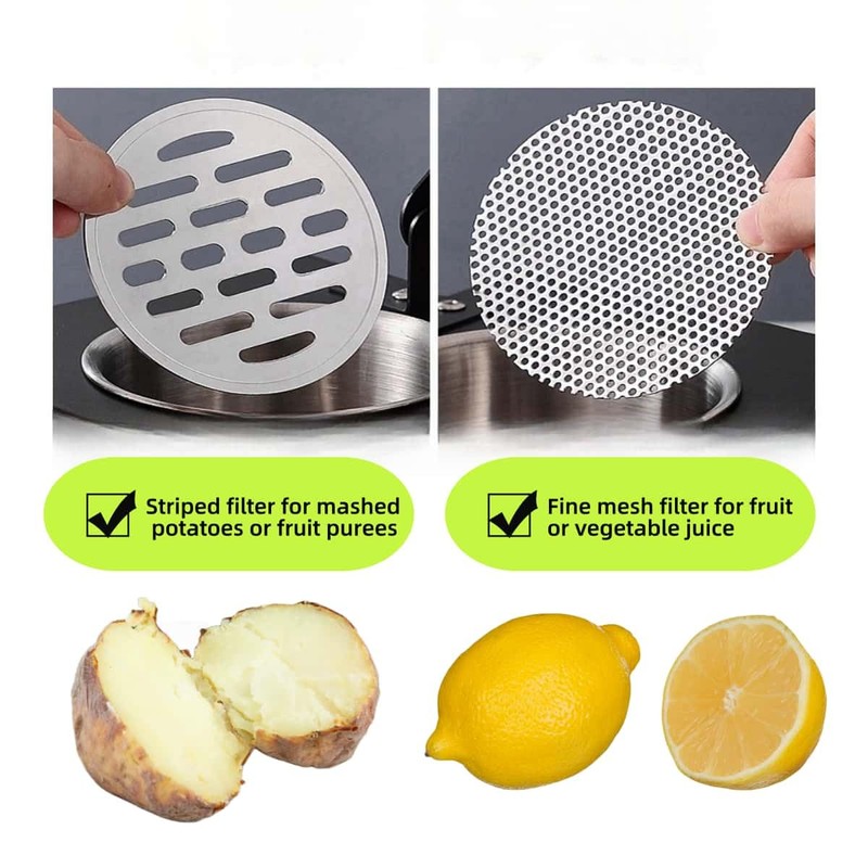 - 【Juicer & potato ricer in 1】 Fine-pored filter filters pure juice, and striped filter allows puree and mashed potatoes to pass through delicately, meeting the needs of processing various ingredients in the kitchen.