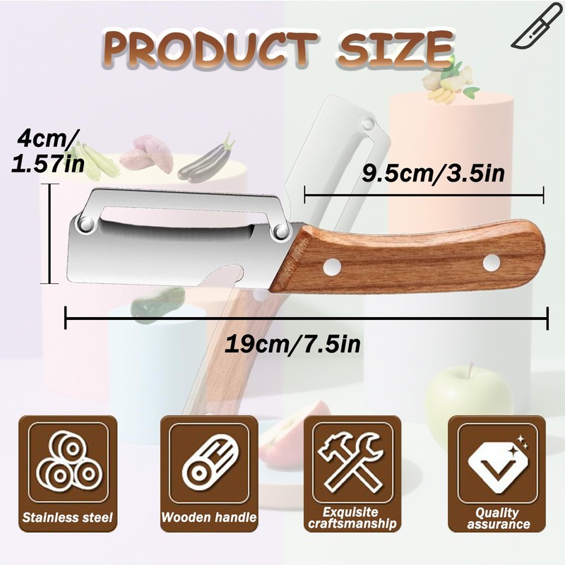 - đăHigh-Quality Material and DurabilityăCrafted with a high-quality wooden handle for a comfortable and natural grip, paired with an ultra-sharp stainless steel blade. The stainless steel material is rust-resistant, ensuring long-lasting use in the kitchen whether you're peeling potatoes, apples, or other ingredients.
