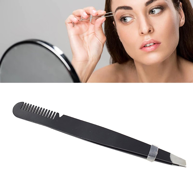 Multi Purpose Eyebrow Tweezers Stainless Steel Ergonomic Precise Slant Tip Eyebrow Tweezers with Comb (Black)