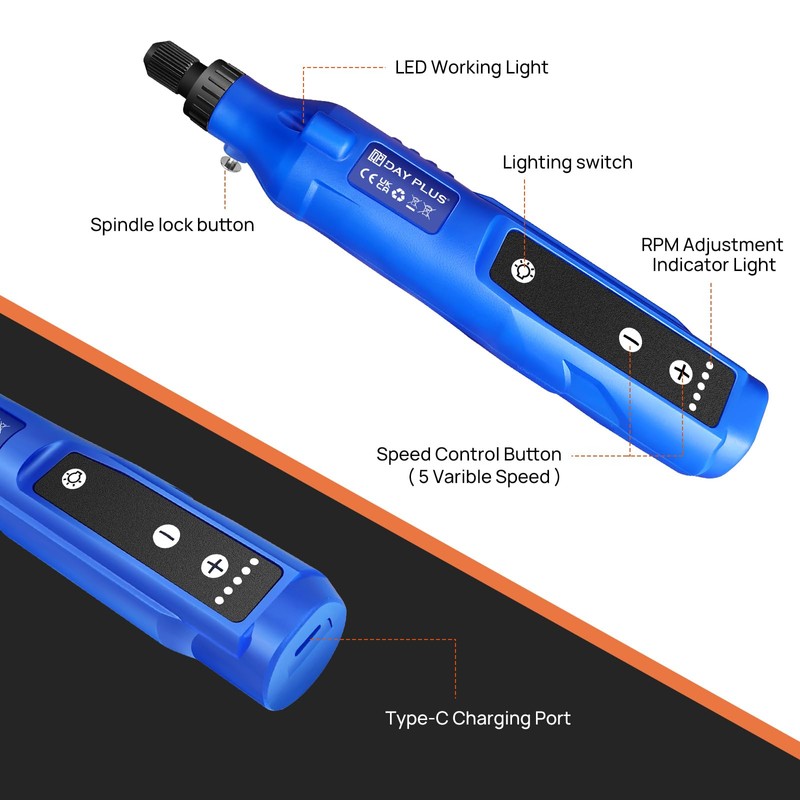 - 5-Speed Adjustable Setting: The mini rotary tool equipped with 5-speed model (3000/6000/9000/12000/18000 RPM), which makes it easier to adjust to a suitable speed to meet the power demand in different scenarios. It allows you to sand safely and carefully in stages. Even people without any experience can get started easily and control the speed easily.