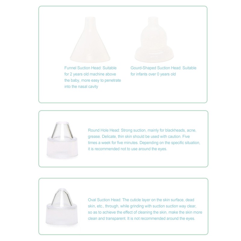 Funnel Suction Head: Suitable for 2 years old machine above the baby, more easy to penetrate into the nasal cavity