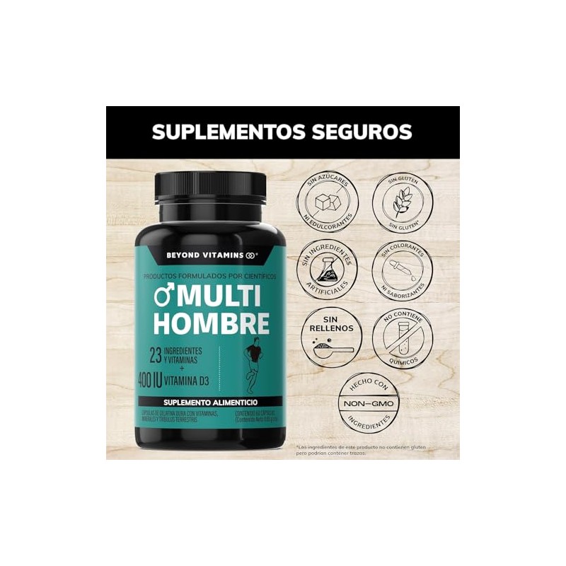 BEYOND VITAMINS - Multi Vitaminas para Hombres | Vitaminas A B1 B2 B3 B5 B6 B7 B9 B12 C D3 E K1 Zinc Calcio Hierro Cobre Cromo Selenio Manganeso Tribulus Terrestris Jenjibre Te Verde L-Arginina (60 cápsulas)