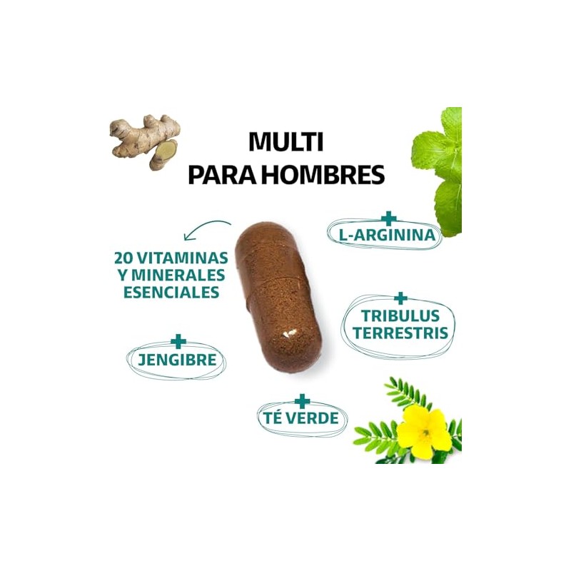 Multi Vitaminas para Hombres | Vitaminas A B1 B2 B3 B5 B6 B7 B9 B12 C D3 E K1 Zinc Calcio Hierro Cobre Cromo Selenio Manganeso Tribulus Terrestris Jenjibre Te Verde L-Arginina (60 cápsulas)