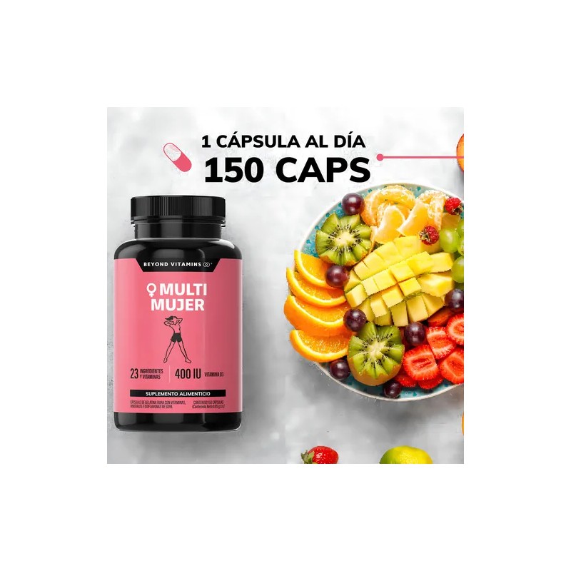 Multi Mujer Beyond Vitamins es un complejo de vitaminas que ofrece una combinación de ingredientes, incluyendo isoflavonas, mangostan, goji, bilberry y 20 vitaminas y minerales adicionales. Este producto no es un medicamento. El consumo de este producto es responsabilidad de quien lo recomienda y de quien lo usa. En caso de dudas, consulte a su médico.
