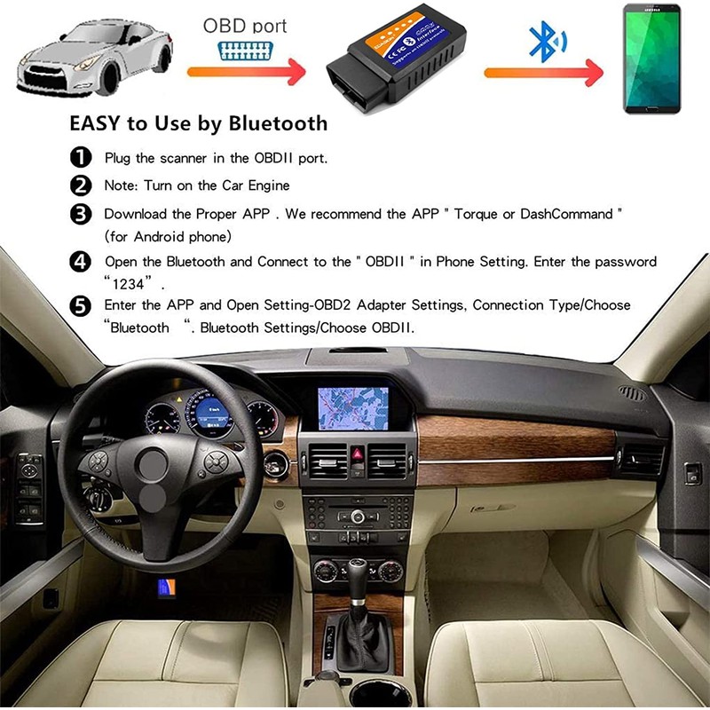 • Download and install the APP, start the car engine, insert the OBD2 scanner into the OBD2 port of the car, turn on the mobile WiFi, search for "OBDII", run the APP and connect to view the fault code. (It is also compatible with applications such as Torque and DashCommand). Support all iOS & Android & Windows smart devices.