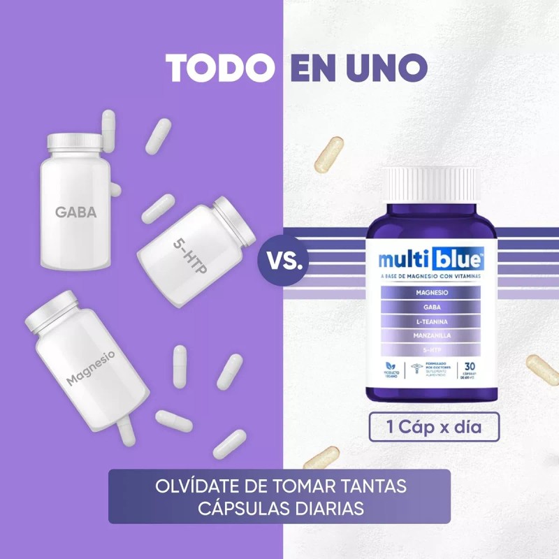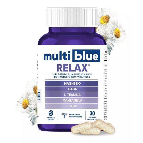 MULTIBLUE RELAX: Suplemento a base de MAGNESIO, L-TEANINA, GABA, MANZANILLA, 5-HTP. Fórmula con ingredientes de origen natural. Contiene 30 cápsulas de 650 mg cada una.