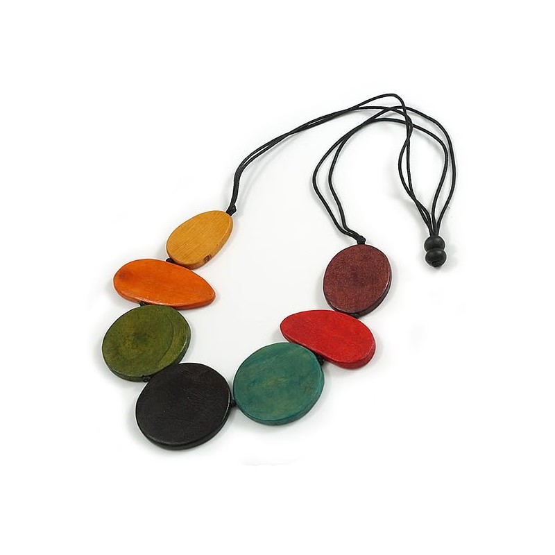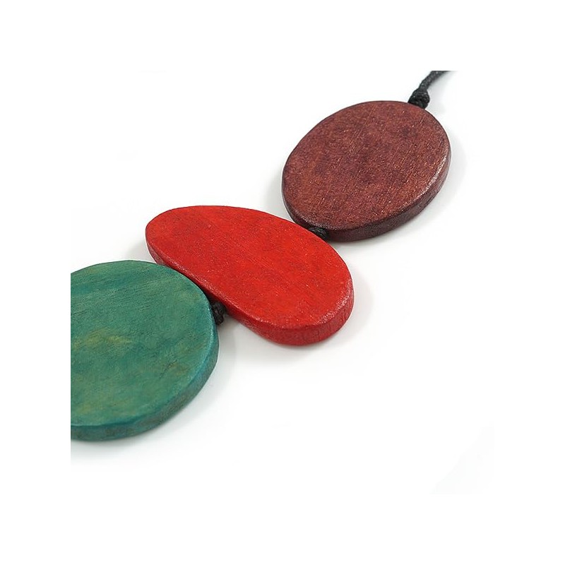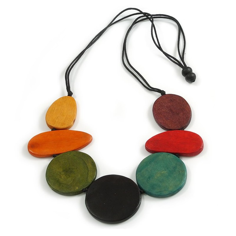 Multicoloured Oval and Round Wooden Bead Geometric Black Cord Long Necklace/ 80cm Long/Adjustable