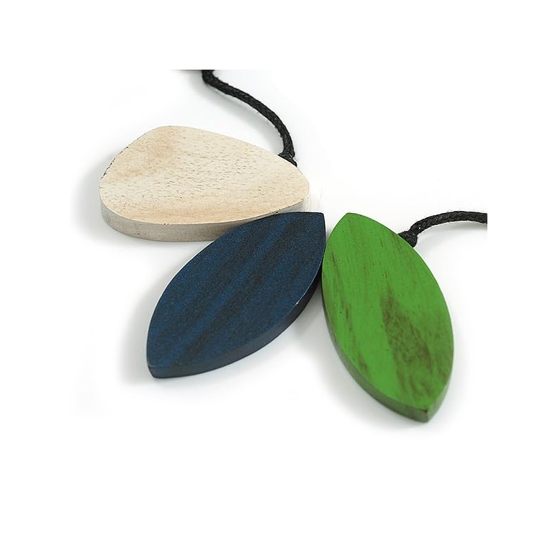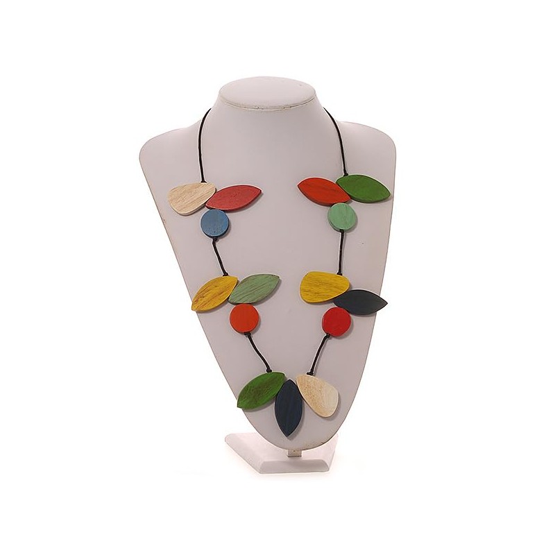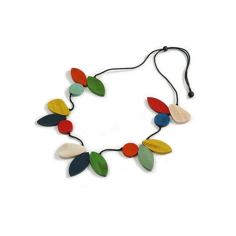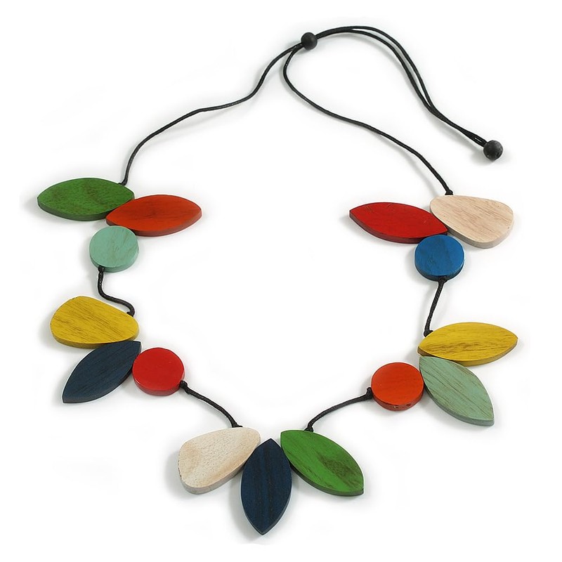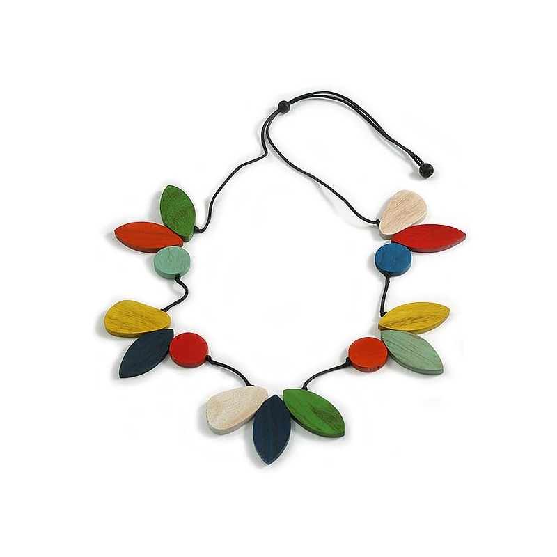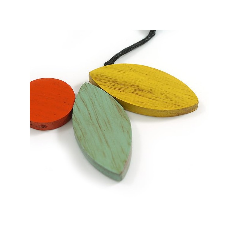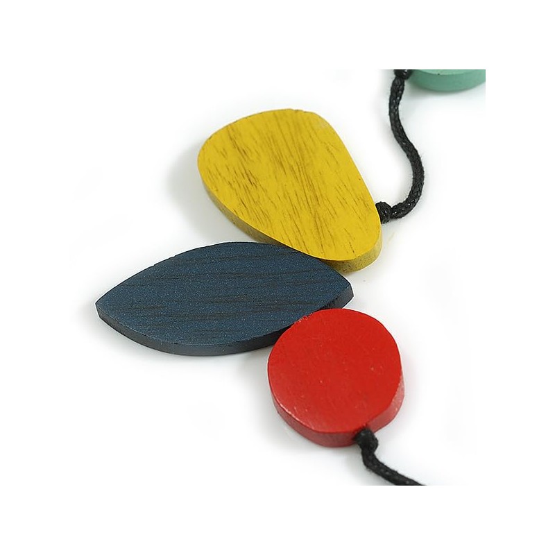 Multicoloured Oval/Round Wood Bead with Black Cotton Cord Long Necklace - 100cm L (Adjustable)