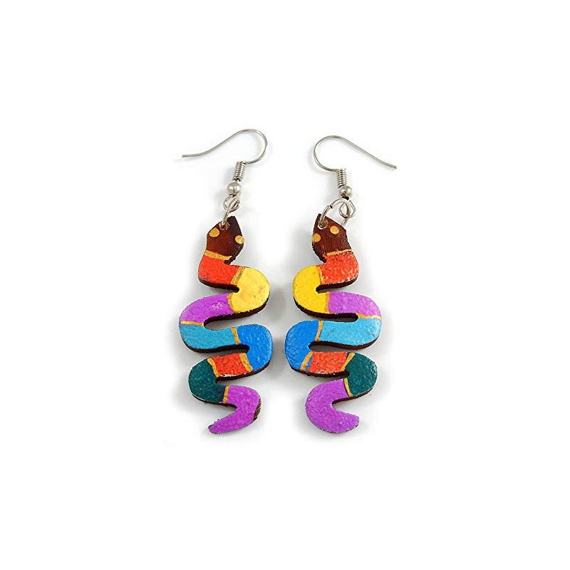 Multicoloured Wooden Snake Drop Earrings/70mm Total Length